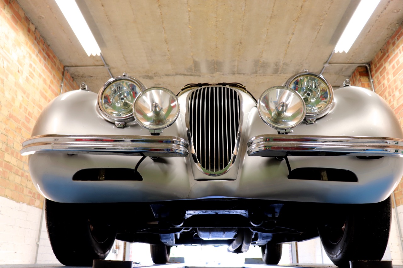 Launched on the 20th October 1948 the American market took to the XK120 immediately and the demand caught Jaguar by surprise. Many Hollywood stars ordered one, which only enhanced Jaguar's image and sales, and in the early days most XK120's went across the Atlantic and it was immediately apparent that the level of demand could only be satisfied by moving from a lightweight alloy-bodied ash frame construction to steel coachwork. This took time and the initial 57 right hand drive cars and 183 left hand drive cars were hand built with a lightweight aluminium alloy. MSU 724 is one of those early alloy cars.